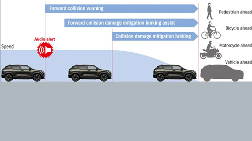 Sistema naudoja radarą ir priekinę kamerą, kad aptiktų transporto priemones, dviračius ir pėsčiuosius tiesiai arba įstrižai priešais automobilį. Jei sistema nustato galimą susidūrimą, vairuotojas įspėjamas garso ir vaizdo signalais. Jei vairuotojas stabdo per silpnai, automatiškai įsijungia avarinio stabdymo asistentas, kuris padeda nedelsiant sulėtinti automobilį. Jei padidėja susidūrimo tikimybė, sistema automatiškai stabdo, kad sumažintų galinčią kilti žalą. |