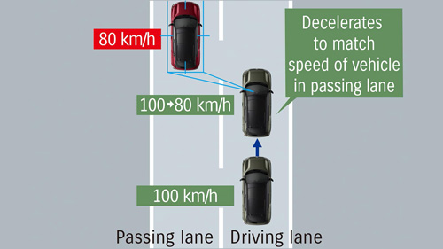 Adaptyvi greičio palaikymo sistema padeda sumažinti vairuotojo nuovargį ilgose kelionėse ir intensyvaus eismo metu, o kartu su kelio ženklų atpažinimo sistema padeda laikytis galiojančių greičio apribojimų. Sistema naudoja milimetrinių bangų radarą ir monokulinę kamerą, kad išmatuotų atstumą iki priekyje važiuojančios transporto priemonės, ir automatiškai greitina arba lėtina greitį, kad išlaikytų vairuotojo nustatytą atstumą. Jei kelias priekyje laisvas, pastovaus greičio palaikymo sistema palaiko nustatytą greitį. |