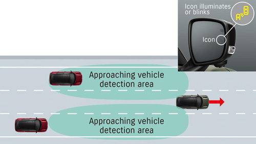 Naudodama milimetrinių bangų radarų jutiklius, sumontuotus galiniame bamperyje, aklosios zonos stebėjimo sistema aptinka transporto priemones, esančias aklojoje zonoje arba įvažiuojančias į ją abiejose automobilio pusėse. Kai sistema aptinka transporto priemonę aklojoje zonoje, šoniniame veidrodėlyje, esančiame aptiktos transporto priemonės pusėje, užsidega įspėjamasis simbolis. Kai vairuotojas įjungia posūkio signalą toje pačioje pusėje, veidrodėlyje mirksi simbolis ir pasigirsta įspėjamasis signalas. |