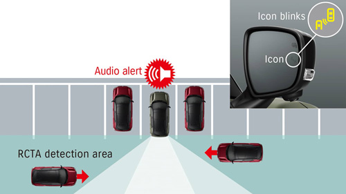 Ši įspėjimo sistema aptinka iš kairės arba dešinės artėjančias transporto priemones, pvz., išvažiuojant atbuline eiga iš stovėjimo vietos ar garažo, ir įspėja vairuotoją apie jas garsiniu signalu bei pranešimu ekrane. |